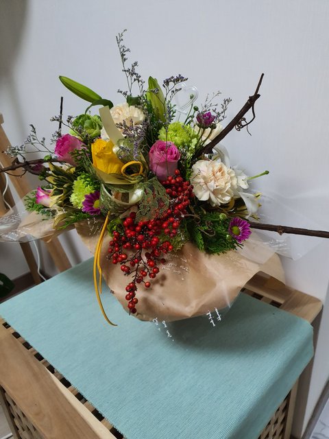 연두색 위주에 제주도에서 길에 자주보이는 빨간색 열매달린 나무 꺾어서 꽂아놈