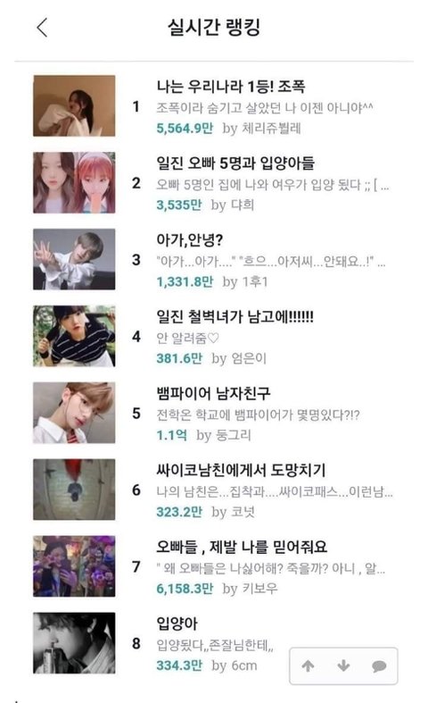ㅊ티라고 초딩들 썰 쓰는 앱인데 나 인생 진짜 개노잼이다 무력하다 이런 애들 앱 깔아서 아무 소설이나 읽어보삼 인류애가 이렇게 바닥을 칠 수 있구나 느끼게 될 거임 진짜 페북에 저거 떠서 장난 삼아 깔았다가 독서실에서 소리지르고 호출 받아서 경고먹은 나로서는 진짜 이것만큼 사람 개빡치고 웃음 나게(ㅈㄴ어이없어서) 할 수 있는 앱 이거밖에 없다 본다 진짜 하 옛날 인소들은 그래도 재밌기라도 했지 이건 개노잼인데다가 항마력도 ㅈㄴ딸림 난 지금 컨디션이 최상이며 괜히 기분 잡치고 싶다 않다 하는 애들은 절대 깔지 말고 나는 넘 우울해서 뭐라도 감정 변화를 느끼고 싶다 하는 애들은 큰 맘먹고 까삼 진짜 분노의 끝을 느낄 수 있다 ㄹㅇ 우리 나라의 미래가 이렇게 밝다 참고로 조회수 억 단위인 소설도 있음 ㅋ ㅋ ㅋ ㅋ ㅋ ㅋ ㅋ ㅋ인소충 쓰닌 모아놨던 엑소 빙의글로 눈 정화하러감 ㅃㅂ