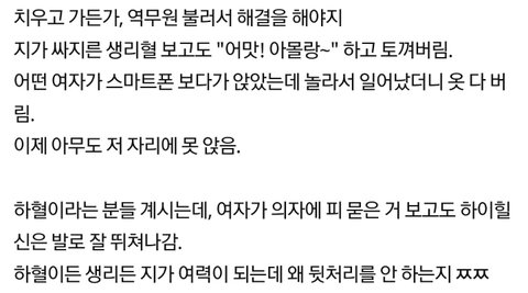 그리고 그 상황에서 우선 생각해야 할 것은 저만한 양의 생리혈을 흘린 당사자의 안위임. 그런데 걱정은 커녕 그 상황을 지켜보고 사진찍어 올린 후에 '무개념민폐녀' 프레임을 씌우고 낄낄.