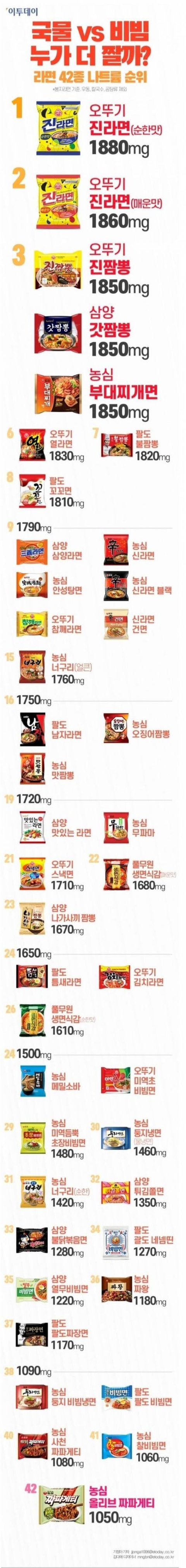 3위보고 오뚜기 까려는 글이구나 알아챔 ㅎㅎㅎ 똑같은 1830인데 왜 가나다순도 아니고 오뚜기가 위냐? 농심이 우선아냐? 오뚜기가 젤 짠거처럼 셋중에 첫번째에 놓았네 웃긴다. ㅎㅎㅎ