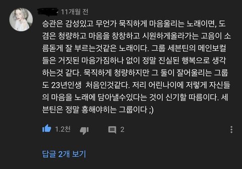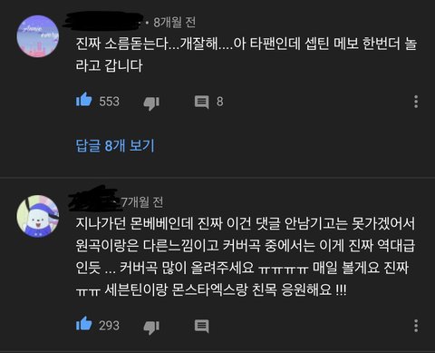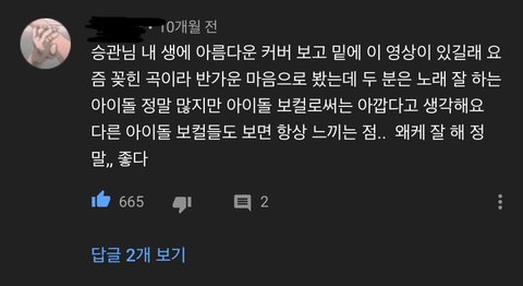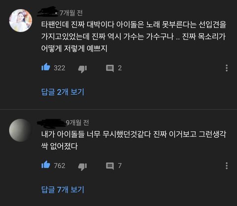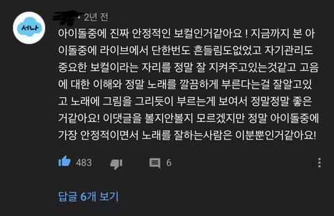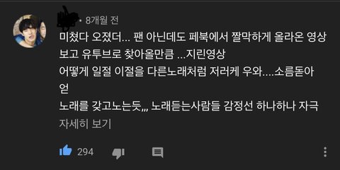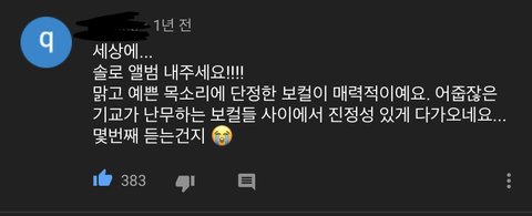 댓글을 봐도 머글들이나 타팬들이 인정할만큼 노래 잘하는데 솔로앨범 한장 안내줌 진짜 제대로 준비해서 내주면 조카 대박일거같은데.. 팬들 생각에만 잘 부르는거 아니냐고 생각하는 어그로들을 위해 유튜브 댓글도 준비해옴