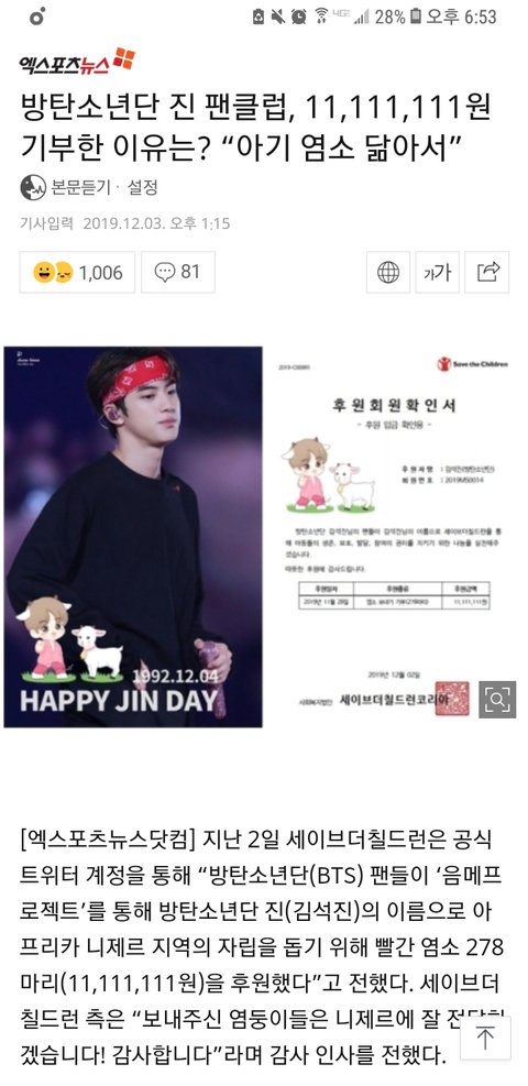 석찌 생일기부 기사 너무 귀여워서 어쩌지ㅠㅠㅠ