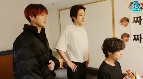 마마 리허설 끝난 후 쉬기도 하고 운동도 갔다오고 피곤해 잠에 든 멤버들이 12시가 지나자 하나둘씩 진의 방으로 찾아와 생일을 축하해줌