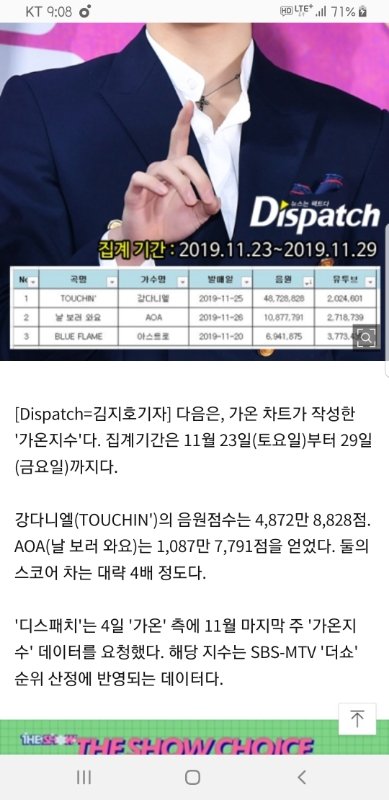 '더쇼' 측은 "제작진도 관련 논란을 접하고 점수를 재확인했다. '더쇼' 점수에서 음반은 10%, 음원은 40%"라며 "강다니엘의 신곡 '터칭(Touchin)'은 디지털 싱글이기 때문에 음반 점수가 0점이다. 하지만 음원점수에서 AOA나 아스트로보다 훨씬 높은 점수를 받아 4000점이 부여됐다. 따라서 강다니엘이 1위가 맞다. 결과에 아무 문제가 없다"고 설명했다.