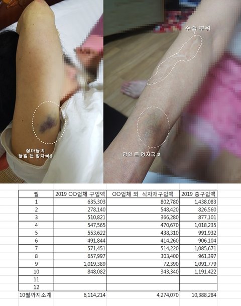 몇 몇 어린이집에서는 ‘OO푸드’라는 어린이집 식자재 구입처에서 전부를 구매하지만 저희 어린이집 경우에는 더 신선한 재료 및 좋은 식자재를 구입을 위해 주문하면 그냥 편하게 배달해주는 업체 대신 절반은 ‘OO푸드’에서 그 외 식자재 절반은 또 발품을 팔아 마트에 가서 식자재를 구입하였습니다. 그 증거로 2019년 급식비 회계 내역서를 공개합니다. 세부품목들 기재는 분량 상 불가능하여 수사기관에 제출하겠습니다.