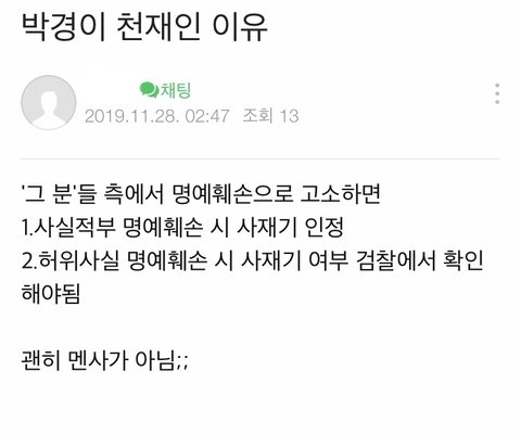 와씨 박경 개천재네. 심지어 여기서 승소하든 패소하든 이미지에 손상X. 승소하면 정의구현이고 패소하면 정의구현 하려다가 불쌍하게 희생당한거 되는 거