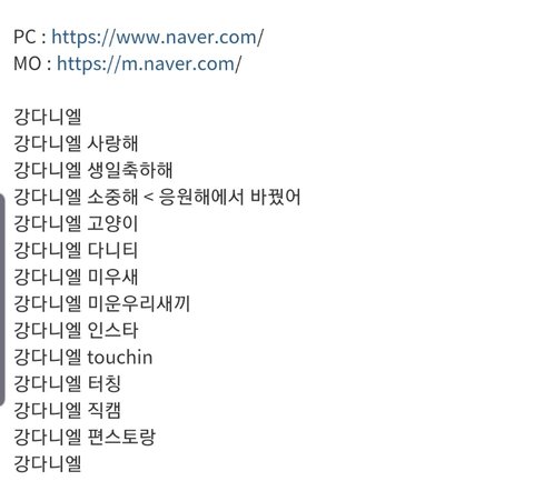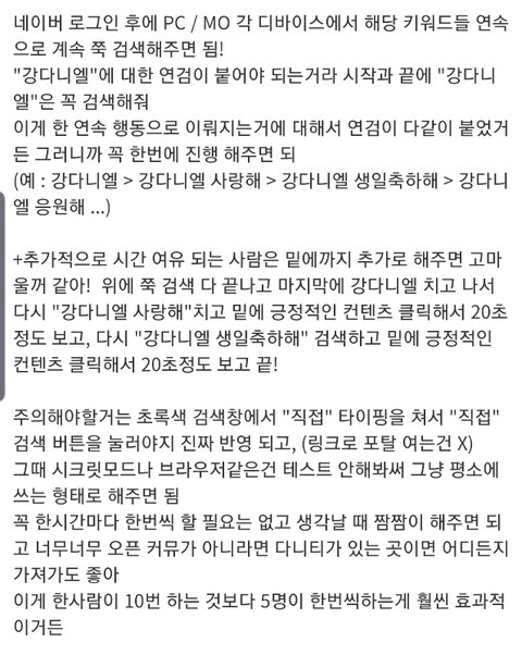 예시보면 알겠지만 강다니엘 → 강다니엘 사랑해 → 강다니엘 생일축하해 이런식으로 이어서 하면된대 여러 사람이 할수록 좋다니까 시간날 때마다 하자