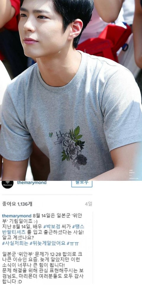 (2015년 8월 14일 위안부 기림일에 마리몬드 티셔츠 입은 박보검)
