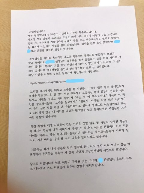 편지에 쓰여진 내용으로 보면, 유튜브에 올린 영상에 대한 법적 문제가 아니라 인스타에 올린 사진들을 보아하니 노출이 있는 선생님의 사진을 아이들이 보고 성적으로 어필될 거라는 둥, 교사들 놀고먹지 라고 생각할거라며 우려된다고 했습니다.