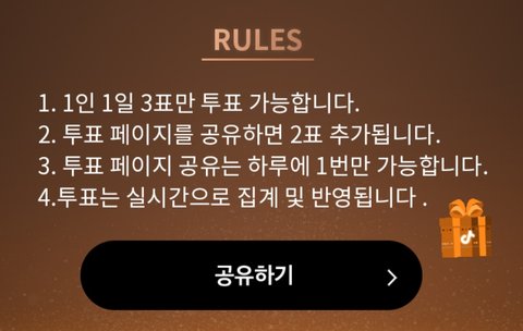 https://vt.tiktok.com/RsPrcf/ 틱톡에서 투표도 해야돼 하루 3번 투표가능한데 투표하고 링크공유하면 2번 더 투표할 수 있어! 다니티 ㅎㅇㅌㅎㅇㅌ❗❗❗