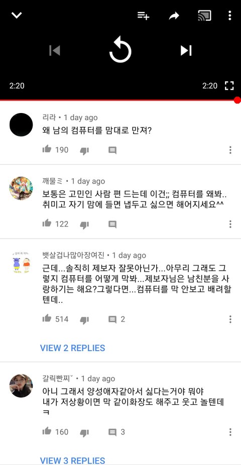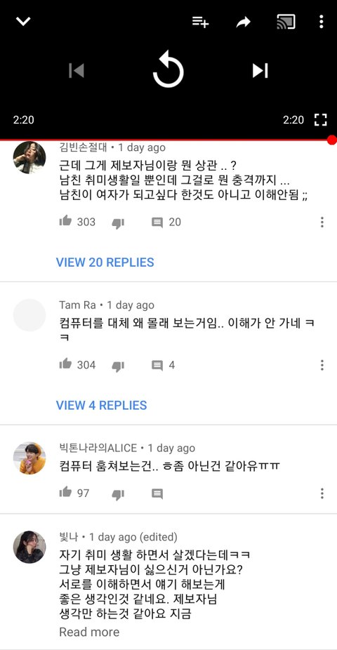 댓글보고 물타기타는거; 영상툰 댓글인데 자기 남친집 놀러갔는데 남친이 여장한 사진들 발견하고 충격받았다는 제보임