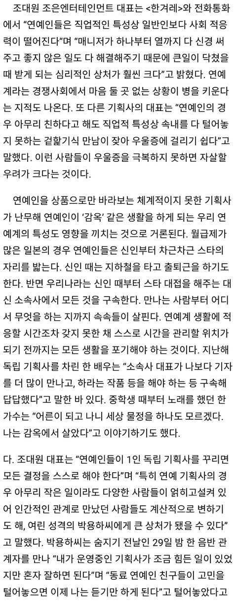 에휴,,개소리마.. 연예계 개더러운데 뒤에서도 앞에서도 상품 취급 당하니 우울증이 안 걸릴수가..다 포장해서 말하는거임 회사 대표들 연예인 사람 취급 안해줌..다 지 물건인줄 알지