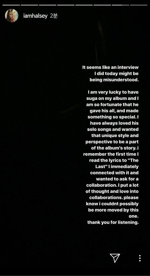 1번째 번역: 오늘 제가 인터뷰에서 했던말이 오해가 될수 있다 생각됩니다. 저는 제 앨범에서 슈가와 협업하게 되어서, 슈가가 최선을 다해줘서, 특별한 곡을 만들어서 매우 운이 좋았습니다. 저는 언제나 그의 솔로 곡들을 좋아했고 그만의 독특한 방식과 관점을 제 앨범 스토리에 넣고 싶었습니다. 전 슈가의 'the last'의 가사를 보자마자 그것과 연결됨을 느꼈고(공감을 했다는 건지 연락을한건지 잘 모르겠...ㅜㅠ) 협업하고 싶어했습니다. 저는 이 협업에 많은 사랑과 생각을 담았습니다. 제가 이보다 더 감동할수 없다는 점을 알아주세요.