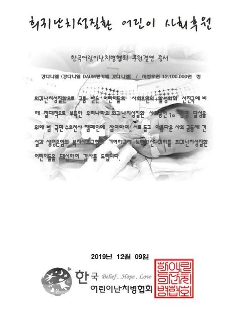 24번째 다니엘군 생일을 기념하여 '한국어린이난치병협회' 기부서포트를 진행하였습니다.