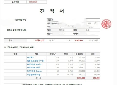 며칠 뒤 문자로 견적서가 왔고