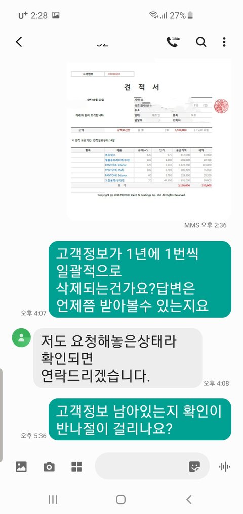 견적서가 있다고하니 그럼 문자로좀 보내달라길래 나눈대화입니다
