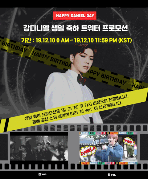 강다니엘 생일 축하 트위터 프로모션은 녤깅과 녤친 두 가지 버전의 영상으로 진행됩니다. 갤배 깅친스워 결과에 따라 녤친버전 영상이 선공개됩니다.