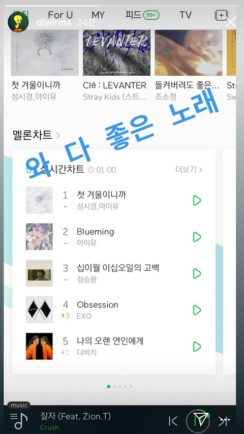 그리고 이게 왜 사재기 저격이냐고 궁금해하는 사람들이 있던데 아이유가 저렇게 공개적인 SNS를 통해서 말한 적 없어. 있어도 자기가 좋아하는 선배님이나 가수분들 노래가 좋다고 홍보한 정도지, 사진에서 보면 1~5위까지 모두 사재기 의심받는 가수들의 노래가 아니잖아. 그래서 간접적이라고 한거야:) 혹시 내 글의 제목이 너무 어그로를 끈 것 같아서 불편했다면 사과할께!