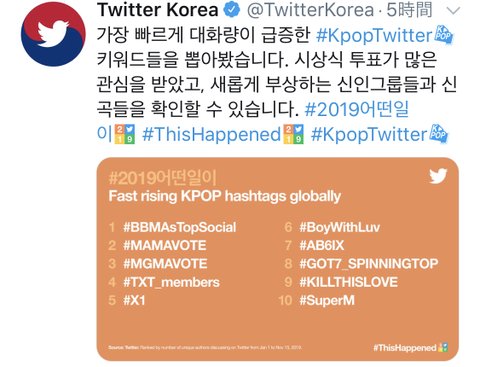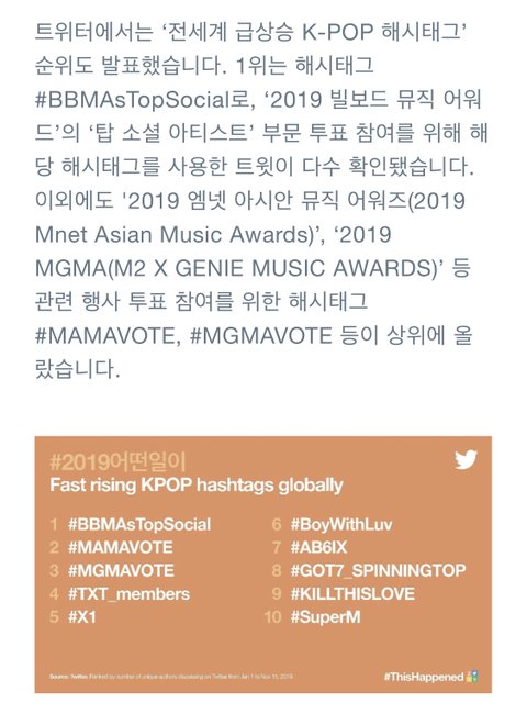 트위터에서는 ‘전세계 급상승 K-POP 해시태그’ 순위도 발표했습니다. 1위는 해시태그 #BBMAsTopSocial로, ‘2019 빌보드 뮤직 어워드’의 ‘탑 소셜 아티스트’ 부문 투표 참여를 위해 해당 해시태그를 사용한 트윗이 다수 확인됐습니다. 이외에도 '2019 엠넷 아시안 뮤직 어워즈(2019 Mnet Asian Music Awards)’, ‘2019 MGMA(M2 X GENIE MUSIC AWARDS)’ 등 관련 행사 투표 참여를 위한 해시태그 #MAMAVOTE, #MGMAVOTE 등이 상위에 올랐습니다.