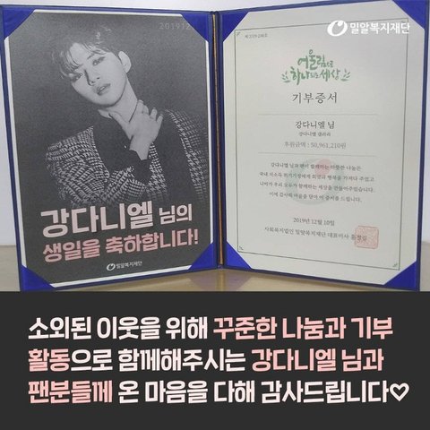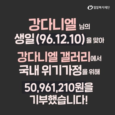 20191210 강다니엘님의 24번째 생일을 진심으로 축하드립니다. 강다니엘갤러리에서 강다니엘 님의 생일을 맞이해 국내 저소득 위기 가정을 위해 50,961,210원을 기부해 주셨습니다.