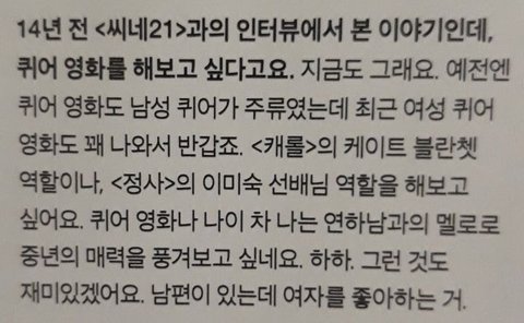 과거 한 인터뷰에서 퀴어 영화를 해보고 싶었다고 밝힌 김서형