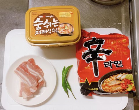 간단하게 취향의 라면을 준비하고 청량고추, 약간의 고기, 된장만 있으면 된다.