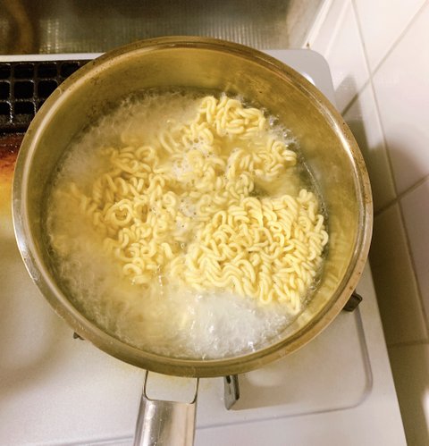 반절만 덜 삶아 준비해서 끓는 라면국물에 면이 익을 때까지 끓여준다.