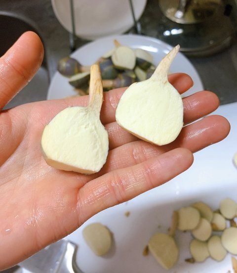 잘라보면 전분끼가 가득한 하얀 속이 예쁘다. 꼭 바닐라 볼 같은^^