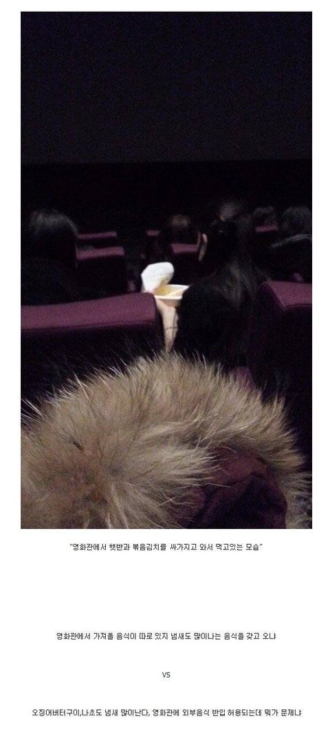 난 좀 반대... 아무래도 영화관 전체적으로 고소 달다구리한 냄새가 풍기는데 저런 시큼한? 냄새가 강한 반찬같은거 갖고오면 팝콘향이랑 섞여서 좀 음쓰냄새 같이 역한 냄새로 느껴져서 불쾌할거같은데...