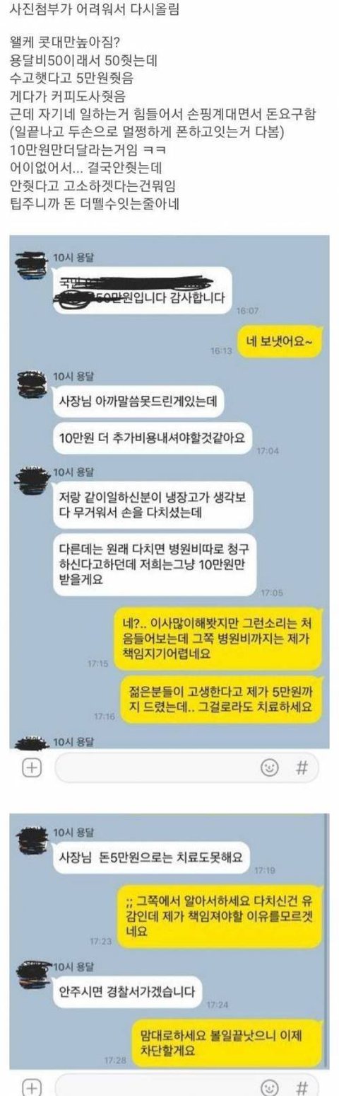 자기네들 업체 사장한테 달라고 해야지. 4대보험 안넣어주면 본인네 회사서 할일이지 무슨 고객한테 치료비청구야?