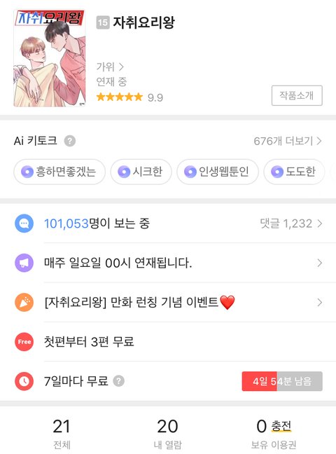 카카오페이지에 일요일마다 연재하고 있는데 자취 요리왕이라는 프로그램에서 비게퍼 하는 내용인데 진짜 재밌어ㅠ 꼭 봐