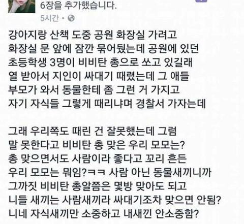 총을 뺏어서 비비탄을 쐈어야지 그 애새끼들하고 그 애새끼들 부모하고. 지들도 웃으면서 비비탄 다 맞으면 인정함