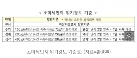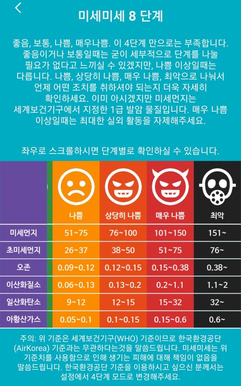 보면 알겠지만 WHO 기준 초미세먼지는 76만 넘어도 최악인데 우리나라에서 이거 기준을 400으로 올려버림ㅋㅋㅋㅋㅋ WHO에선 최악의 사태인데 한국에선 평온한 상태