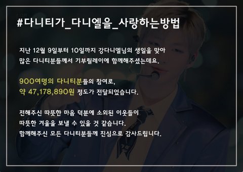 강다니엘 님의 생일을 맞아 다니티 분들께서 기부릴레이를 진행해주셨습니다.
