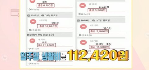 PT등록비 제외 일주일 생활비 약 11만원으로 한달에 50만원 이하라고 함