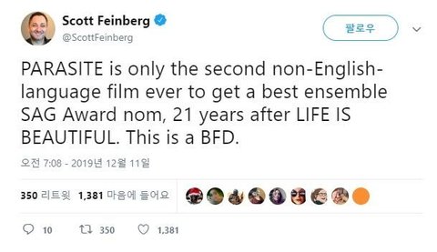 "기생충은 역대 2번째로 미국 배우 조합상 최고의 앙상블 부문에 후보로 오른 비영어권 영화입니다.