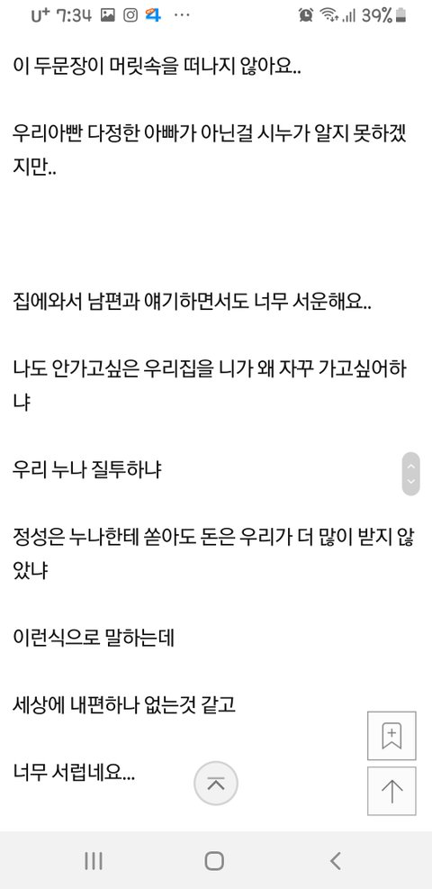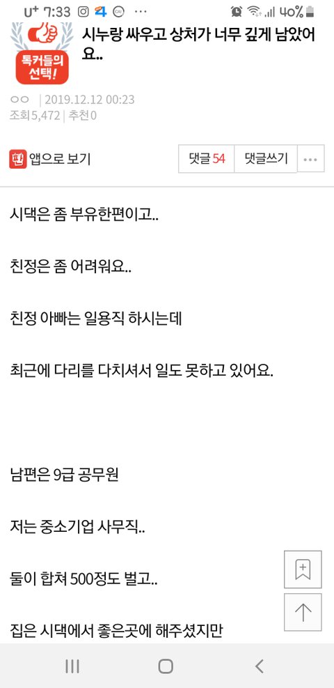 시누 애가 이쁘기까지했으면 자격지심에 돌아버리셨겠네~~자격지심있는 사람들은 아무리 진심으로 걱정하고 위로해도 꼬아듣고 혼자 분개하던데....정상적인 대화가 길게 안되더라...그런인간이랑 살고있다보니 내가 미치겠네