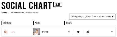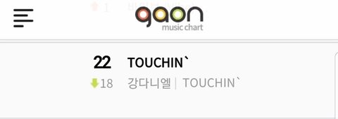주간 소셜차트2.0에서는 강다니엘이 1위에 올랐다. 집계 기간동안 V LIVE 강다니엘 채널에서 가장 인기를 얻은 콘텐츠는 ‘강다니엘 (KANGDANIEL) DIGITAL SINGLE - TOUCHIN' M/V’이었으며, 마이셀럽스 빅데이터를 통해 얻은 매력키워드는 ‘카리스마있는’, ’몽환적인’ 등이었다.