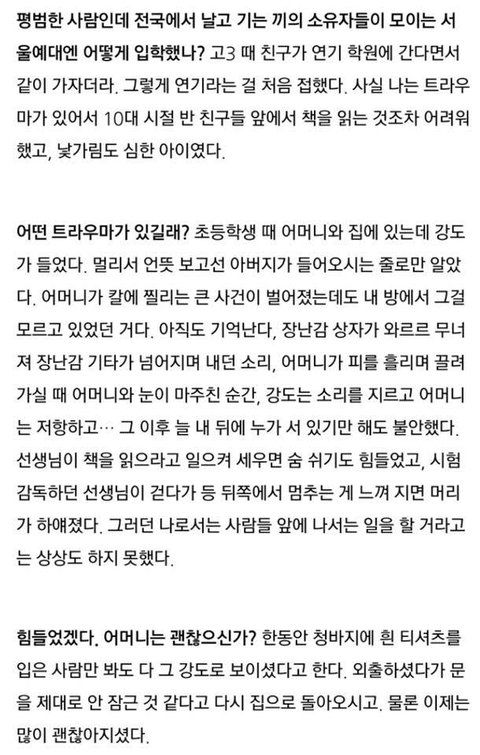 와 지금도 뒤에 사람있는거 같으면 소변도 못 본다니 상상할 수 없을정도의 극한의 공포인가보다.. 얼마나 트라우마일까 엄마가 강도한테 칼에 찔려 피 흘리고 있는 장면이 아직도 생생하다는게 너무 마음 아프고 트라우마 극복이 힘들겠지만 서서히 나아졌으면 좋겠다.. 많은 사람들 앞에 서는 배우라는 꿈을 가지고 예고에 입학하겠다고 마음을 먹은 것 자체가 대단하고 존경스럽다ㅠㅠ 앞으로는 정말 좋은 일만 있길 바래요!!
