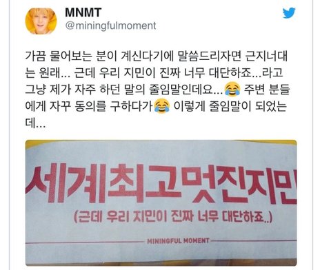[사자성어] 지민의 한 홈마가 사담계에서 지민을 앓는 용도로 사용하던 '근데 우리 지민이 진짜 너무 대단하죠'의 줄임말. 이후 홈마의 슬로건에도 박제될 정도로 유명하게 앓는 말이 되었으며, 팬사인회에서 지민에게 근지너대가 무엇인지 맞춰보라고 하자 지민은 '근심 지민이 너구리 대머리', '근데 지민이 너무 대리고 가고 싶어' 라고 대답했다.