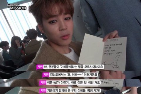 [명사] '이쁜이'를 뜻하는 경상도 사투리. 2014년~2015년 사이에 지민이 아미들에게 자주 불러주었던 호칭으로, 지민피셜 '아휴~ 이쁜 것~' 이라는 의미라고 한다.