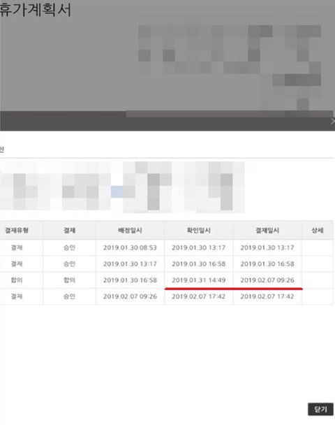 <병원진료를 위한 연차 올린걸 확인했으면서도 일부러 8일 뒤에 결재해준 사진>