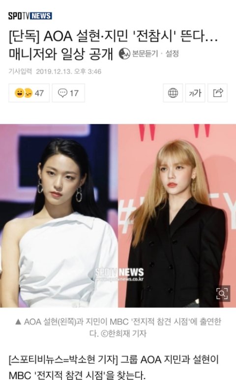 [단독] AOA 설현·지민 '전참시' 뜬다…매니저와 일상 공개