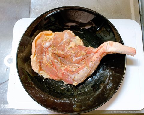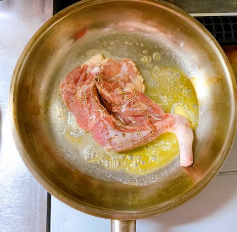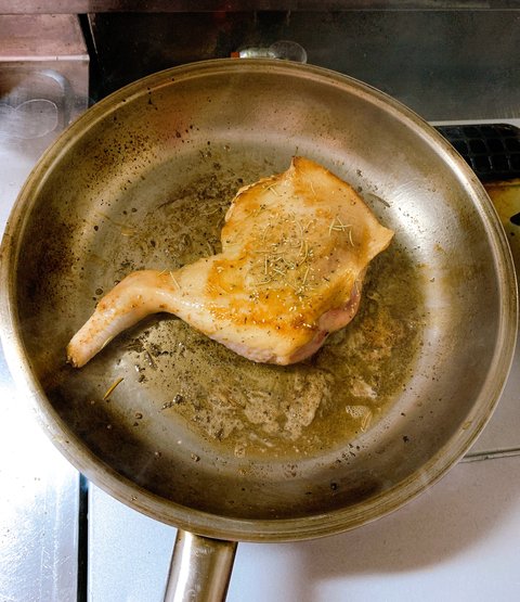 약간 숙성 된 닭다리살을 버터를 녹인 팬에