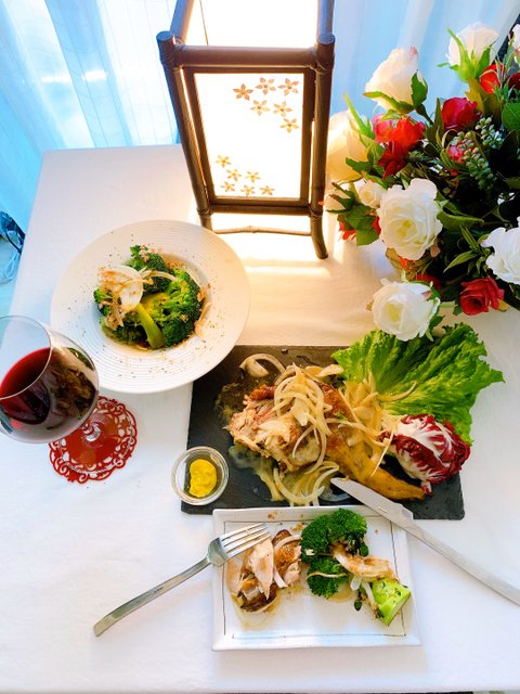 참깨 소스 닭다리 & 새콤한 브로콜리 스테이크