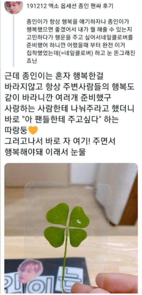2. 한 팬이 카이의 행복을 바라며 네잎클로버를 여러개 주면서 이거 카이도 갖고, 행복해졌으면하는 주변사람들에게도 선물하라고 하니까
