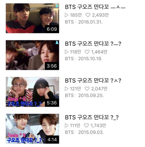 [대명사] 팀 내 95년생 동갑내기인 지민과 뷔를 부르는 말. 고등학교 시절 똥강아지 때부터 함께 커왔기 때문인지, 여전히 둘이 있으면 투닥투닥 똥꼬발랄한 현실 친구 느낌이 주를 이룬다. 누구보다 장난도 많이 치고 서로 다른 면이 많음에도 불구하고, 항상 곁에 있는 다른 멤버들도 그 감정을 모를 것이라고 이야기할 정도로 친하다. 둘을 오랫동안 봐온 팬들은, '구오즈가 엄청 친한 줄 알았는데 생각보다 안 붙어 있어서 의외라고 생각했지만 알면 알수록 구오즈는 둘만의 무언가가 있다' 라고 공통적으로 말하기도. 특히 악몽을 꾼 뷔를 위해 드림캐쳐를 선물한 지민 일화, 사고 싶은 것을 사면 주어진 예산이 남지 않는다는 지민의 말을 기억했다가 이후에 깜짝 선물해준 뷔의 일화, 뷔의 자작곡 '윈터베어'를 듣고 곰인형을 선물한 지민과 그 선물로 커버사진을 장식한 뷔의 일화, 지민의 자작곡 커버사진을 찍어준 뷔의 일화 등 현실에는 절대 없는 몽글몽글한 감성을 공유하는 두 친구를 보고 있자면, '구오구오ㅜㅜ 오구오구ㅜㅜ' 하며 울게 된다는 게 학계 정설. 특히 서로는 서로에게 어떤 친구냐는 2017년 어느 인터뷰에서, 처음부터 모든 걸 공유하는 사이는 아니었지만 벽을 허물고 지금은 깊은 이야기를 나누는 사이라며 앞으로도 많이 싸울 것이고 그만큼 더 친해질 것이라고 대답해 많은 아미들을 구오구오하게 만들었다.