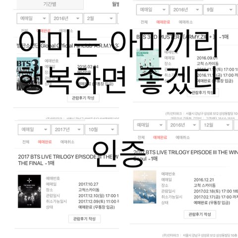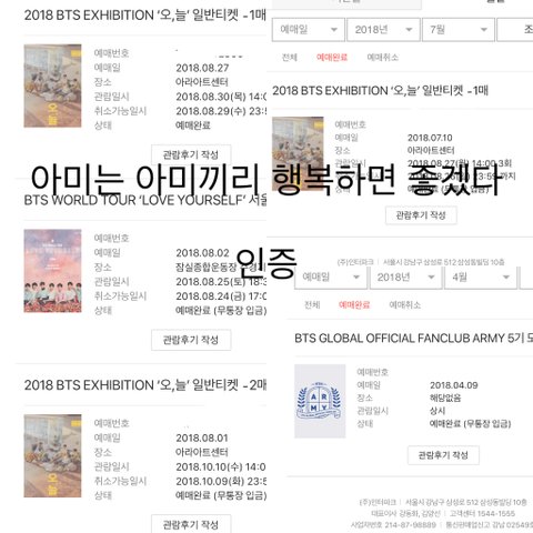 +) 인증 ! (앨범이랑 굿즈를 대부분 팔아서 내 아이디로 예매한 최근 것들 보여줄게!/ 아미밤 2이랑 콘서트 슬로건들 지금 다른 방에 있어서 내일 아침에 추가할게!)