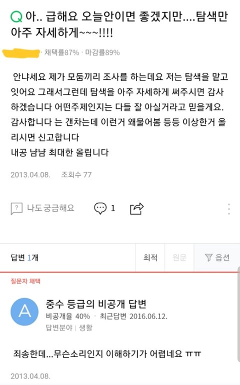 옛날에 썻던 지식in을 보면 아주 가지가지인데 다른것들은 흑역사여도 말을 이해할 수는 있는데 저건 뭔생각으로 쓴걸까 저때 내가 초6이었는데 조별과제로 주제를 주고 하나씩 역할을 맡아서 난 탐색인가 그걸 맡앗나봐 주제를 말하고 탐색에대해 자세히 알려달라해야되는데(이것도 말하면서 뭔소린지 모르겠ㅇ) 주제는 뭔지 다들 아시겠죠? ㅇㅈㄹ 왜저래 나