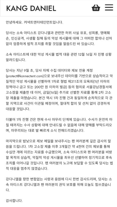 당사는 소속 아티스트 강다니엘과 관련한 허위 사실 유포, 성희롱, 명예훼손, 인신공격, 사생활 침해 등의 악성 게시물에 대해 그 어떠한 합의나 선처 없이 엄중하게 법적 조치를 취할 것임을 말씀드린 바 있습니다.